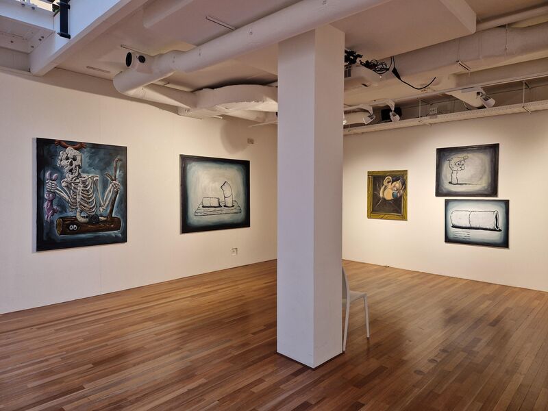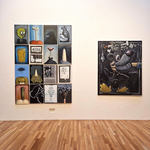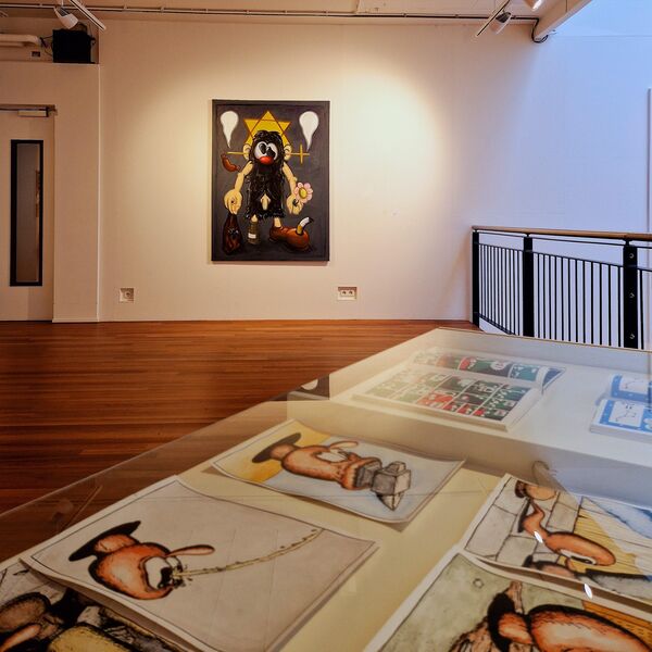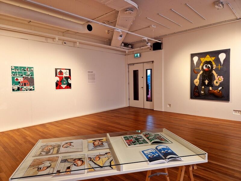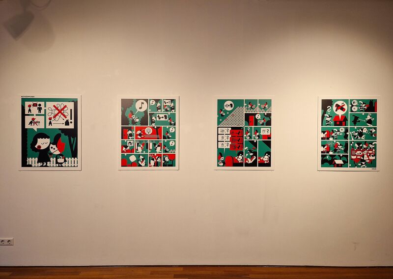 Frank Flöthmann is een freelance grafisch ontwerper en illustrator uit Berlijn, met een specialisatie in verhalende kunst. Hij maakt woordloze strips in een pictografische stijl. Franks debuutstripboek ‘Sprookjes van Grimm zonder woorden’ was een verrassend succes. Zijn versies van twaalf bekende van de gebroeders Grimm verhalen bieden uitgeklede plots, alternatieve eindes en verrassende wendingen. In onze tentoonstelling vind je de verhalen van Roodkapje en Duimendik. Zijn gebruik van harde complementaire kleuren rood en groen zorgt voor een expressieve lading die de duidelijkheid van de gebruikte pictogrammen onderstreept. Het schreeuwt om jouw aandacht, en die heb je nodig. Goed kijken, pijltjes volgen en soms je hersen kraken om de uitspraken gepresenteerd als een bijna wiskunde formule te ontcijferen. Wat een hyperefficiënte manier van vertelling lijkt eindigt als een tegenstelling daarvan, als verwarring.